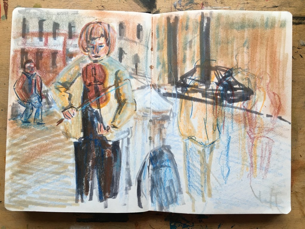 Above, I have drawn from video some live music scenes to explore communicating visually with observational drawing. I felt very moved drawing these scenes, and seeing the impact music had on people. They are both extremely talented and captured people’s attention with a mindful pause during the hustle and bustle of the streets. I wanted to capture the moving figures around the musicians, with the musicians more grounded in the drawing acting as a pivot for the rest of the scene to move around. I drew in layers, firstly with brush pen, then pencil and lastly neo colour wax crayon, to build up the moving energy of the scenes.
