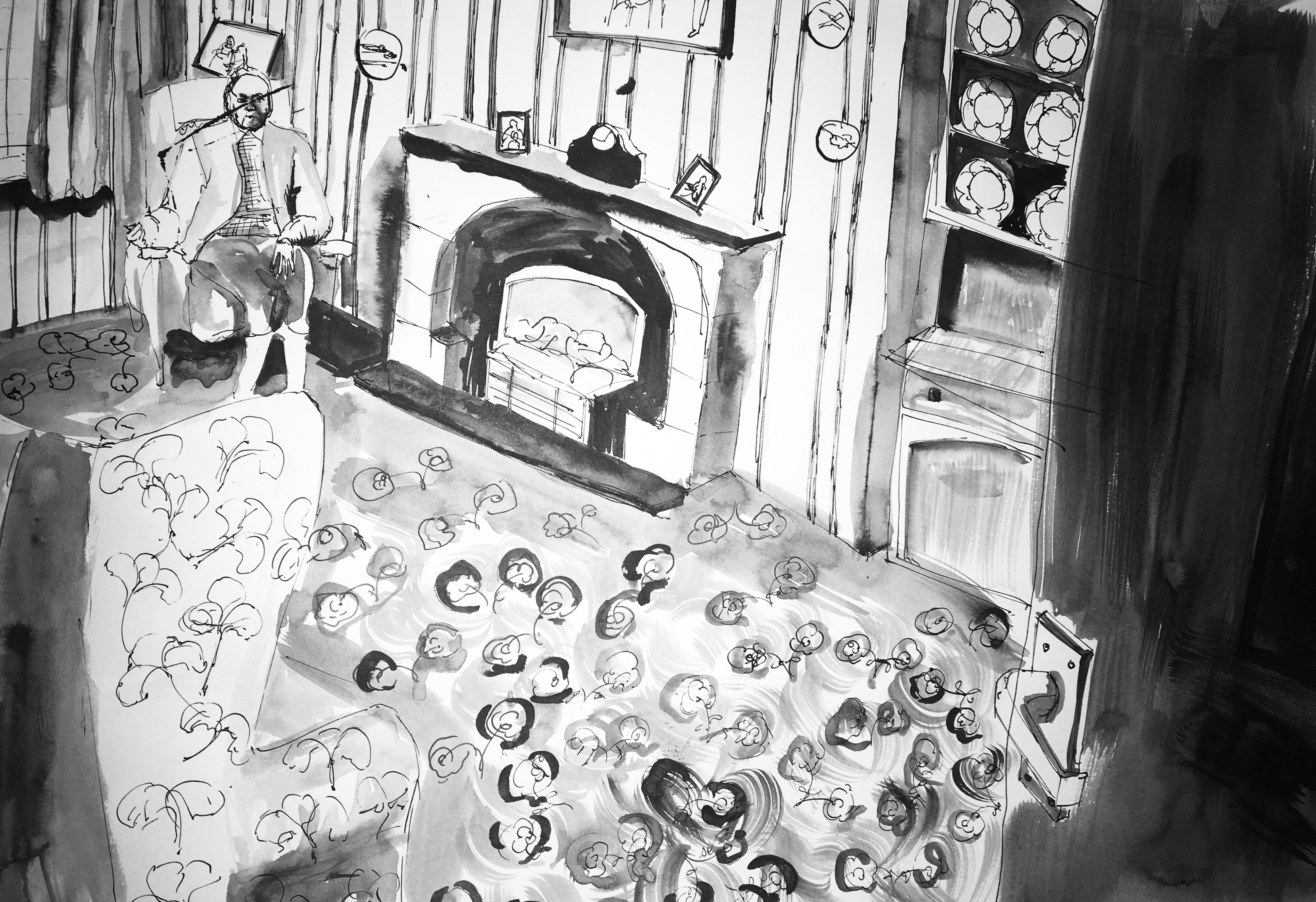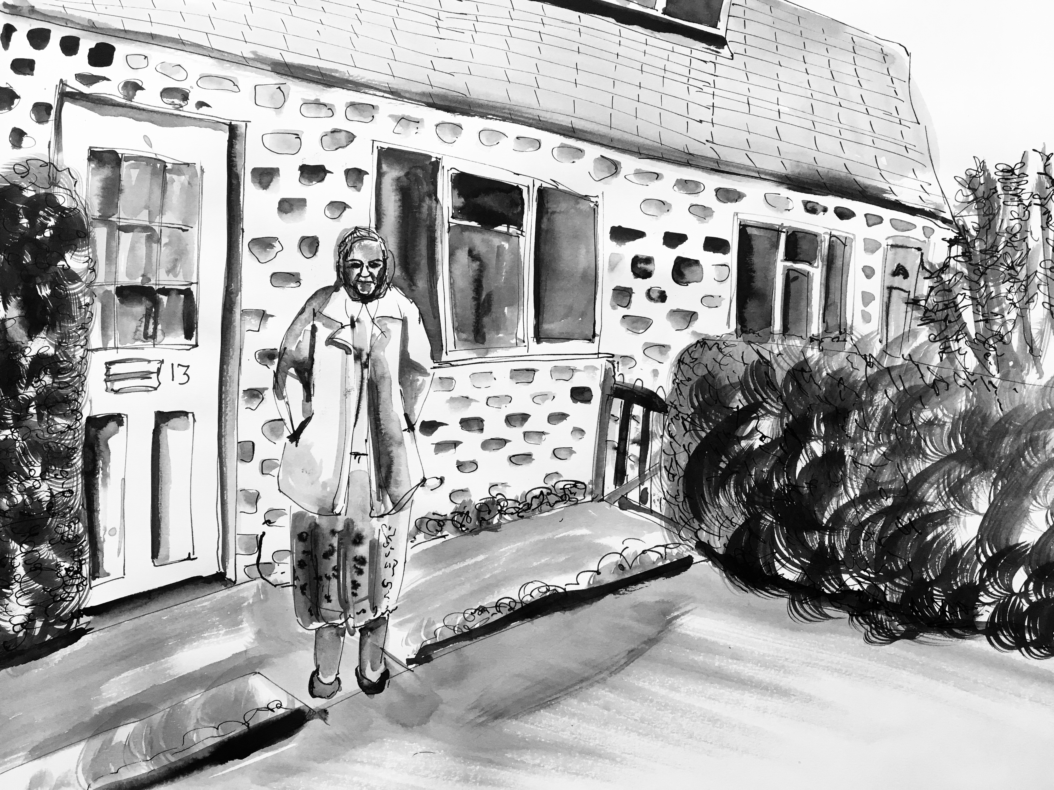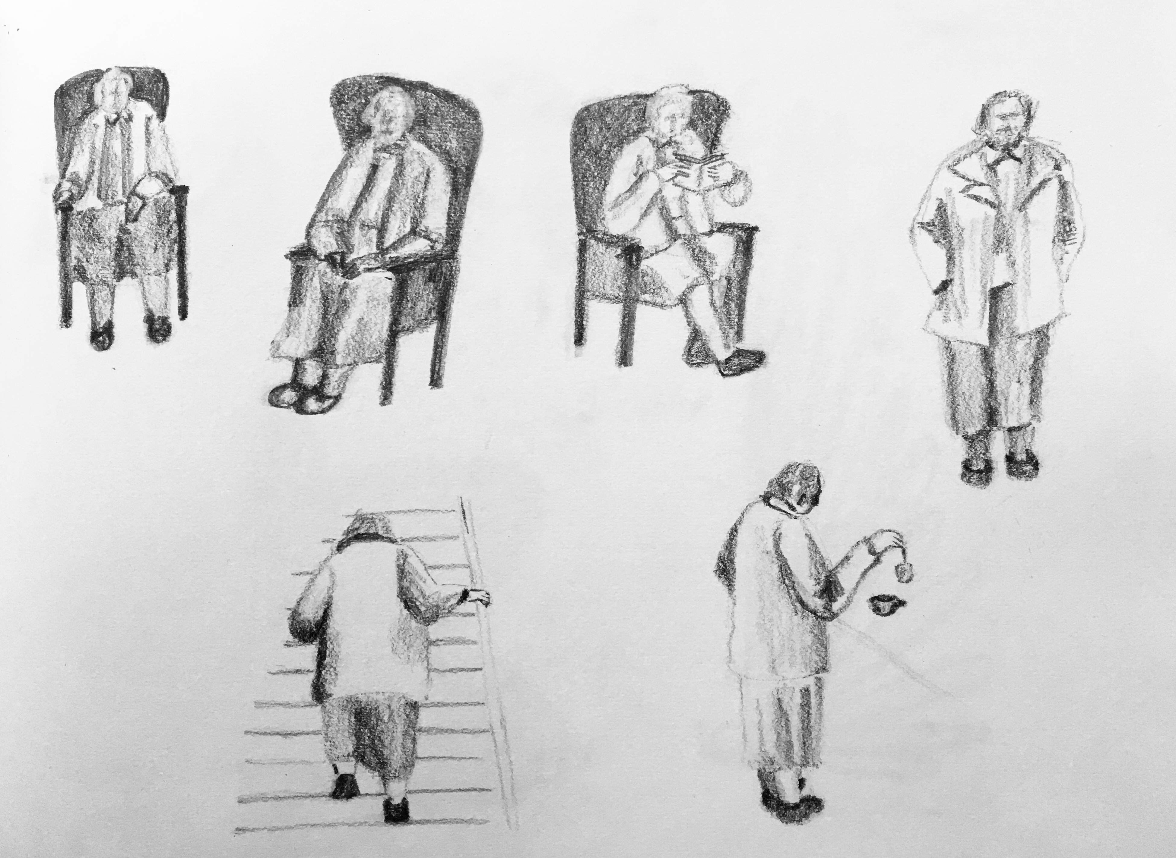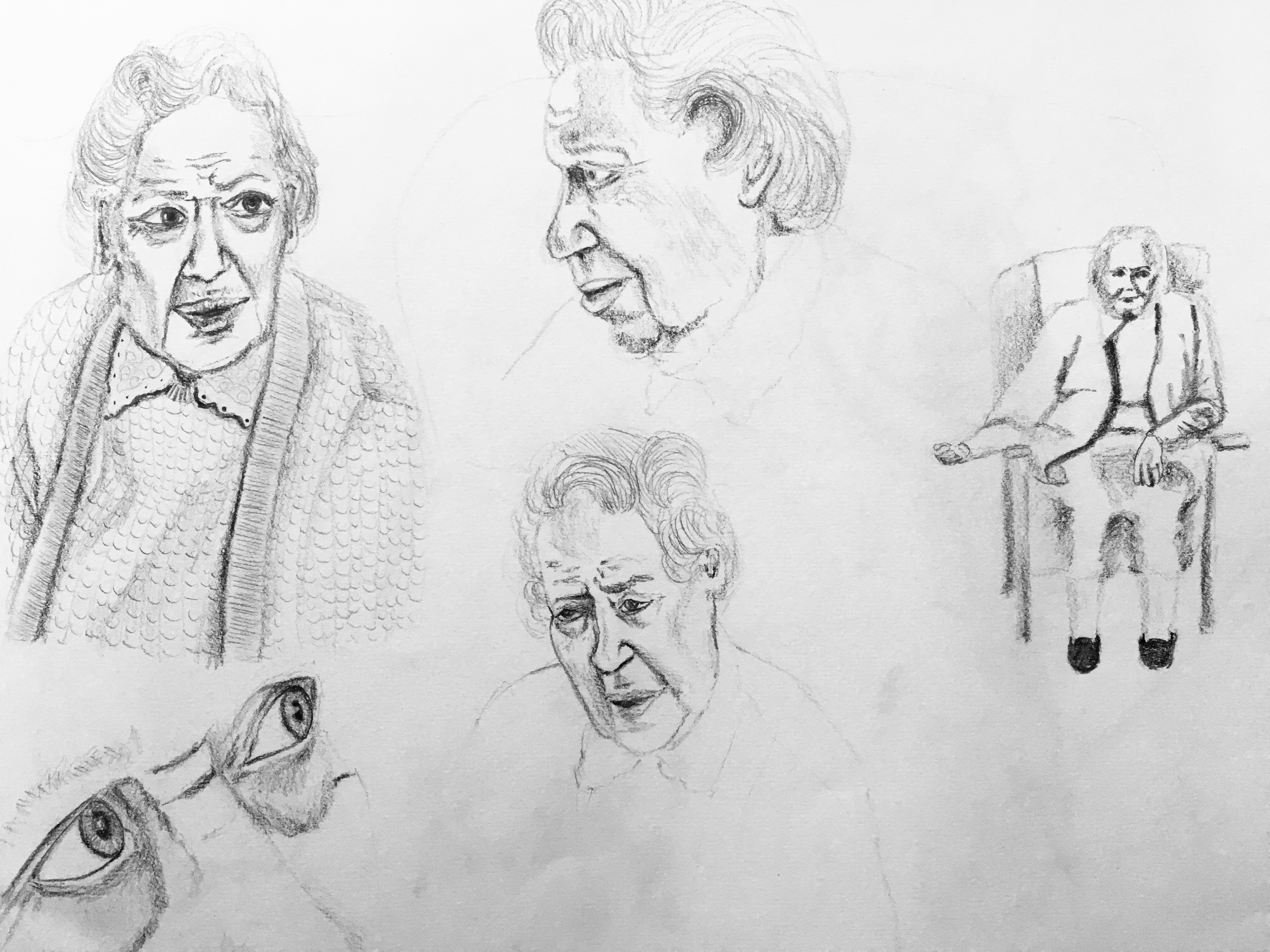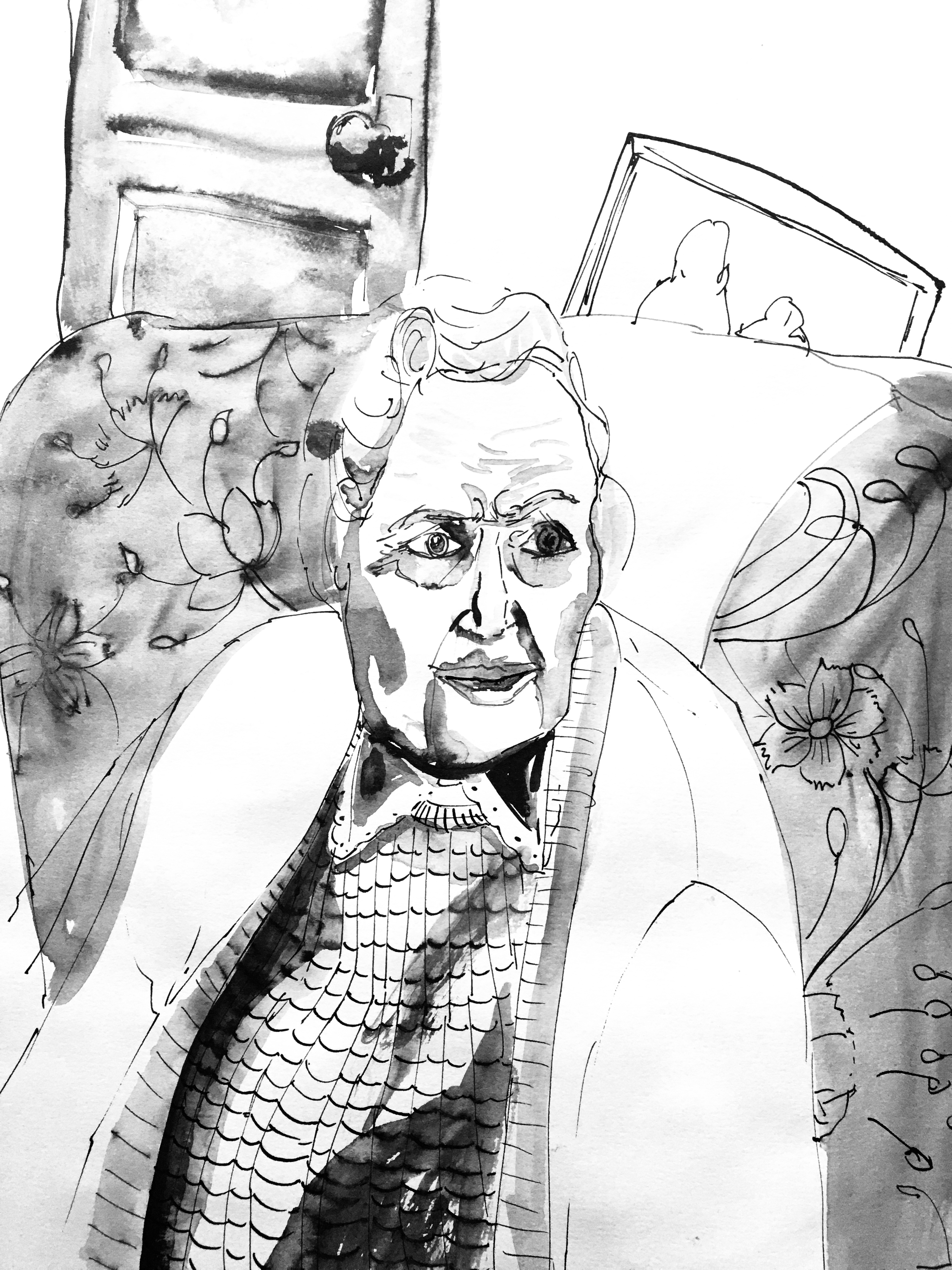 I began to draw from video as my observation using dip pen and ink. I had researched Reportage Illustrator Jenny Soep (see previous post) who uses wash and pencil to help explore the relationship between shape and the detail that will tell the essential crux of the story. I enjoyed using a dip pen and ink, but wanted a softer medium to portray my character, as the video I drew from, told her story of loneliness. I felt the pencil portrayed a vulnerability.