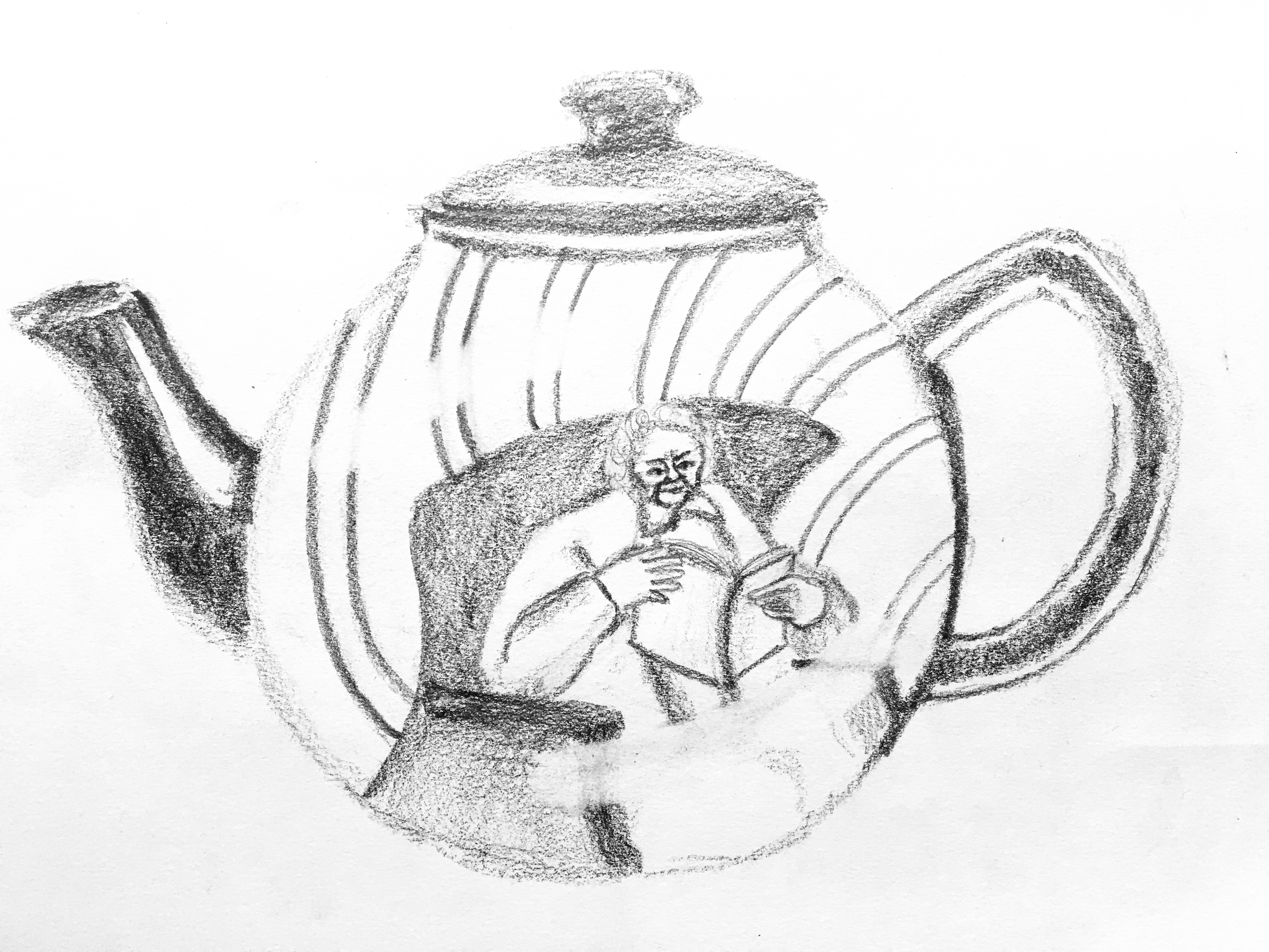 I then began to think about how I could create a character from these drawings. I read Linda Barry’s book, making comics, who suggests a drawing exercise where you draw a closed shape and turn it into a character. This was a very fun and playful exercise, which helped me reflect on the back story I had created for Margaret. Margaret is a sweet eccentric lady who collects tea pots and loves gardening. I started to think of a composition to combine Margaret with a teapot. I decided to draw Margaret in the reflection of the teapot, which I felt portrayed her character and also created a distance between the character and audience. Margaret is reaching out towards the teapot and out towards the audience, which shows her sense of loneliness in old age.