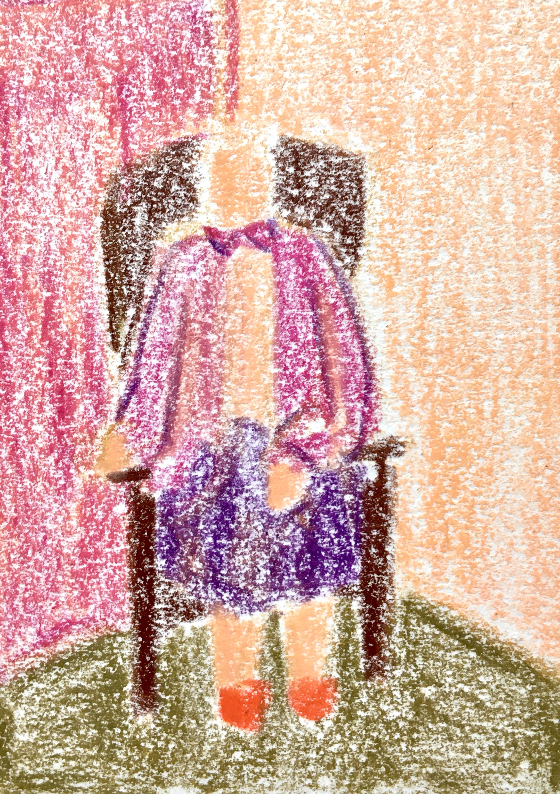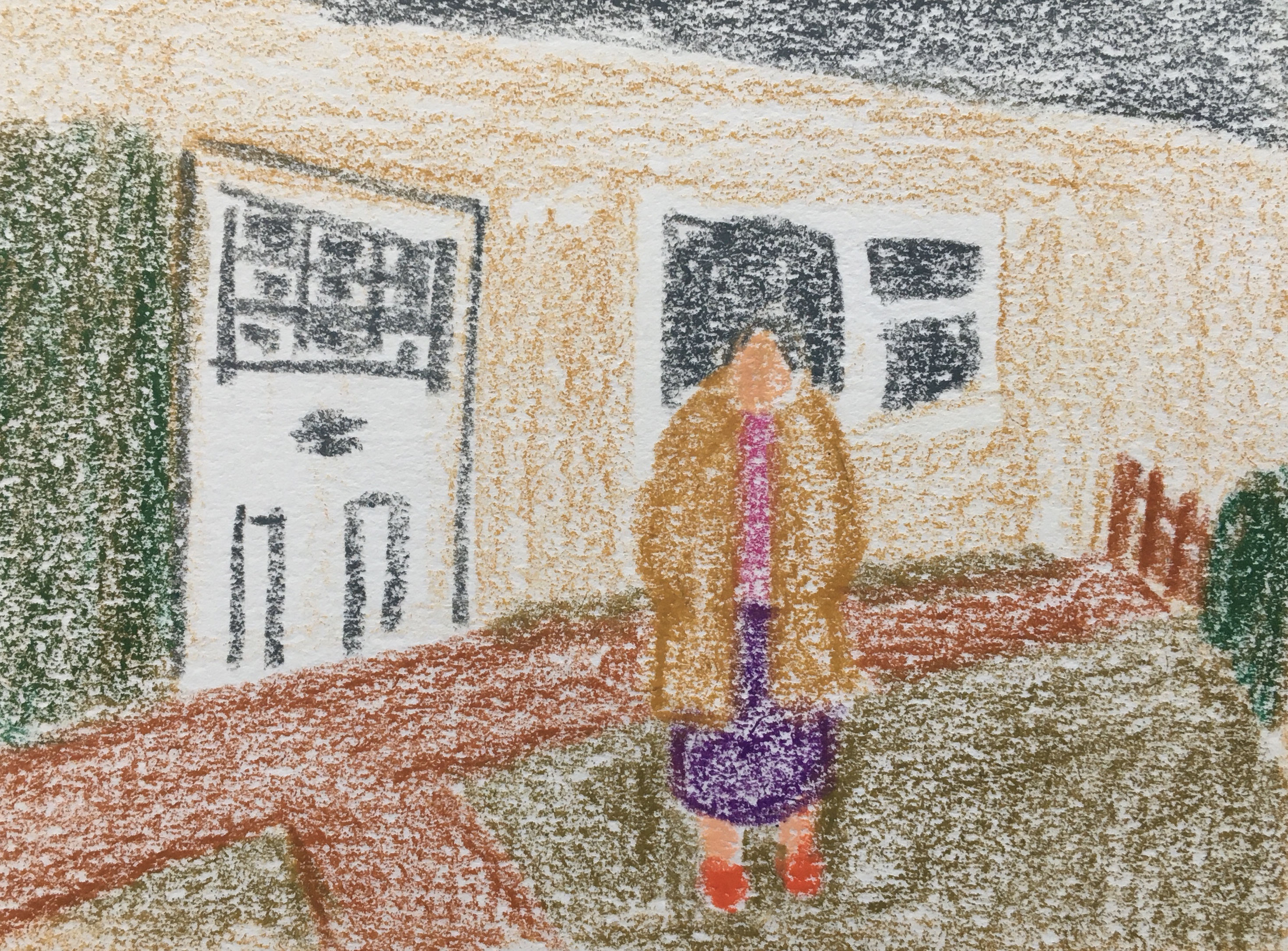 I then explored the silhouette, to make sure the whole body was communicating an expression, not just the face. From these silhouettes, I picked 2, to begin developing in colour. I drew the colour as shapes, to see if the composition worked before developing a more detailed drawing. This helped me get to know my character, who I named Margaret.