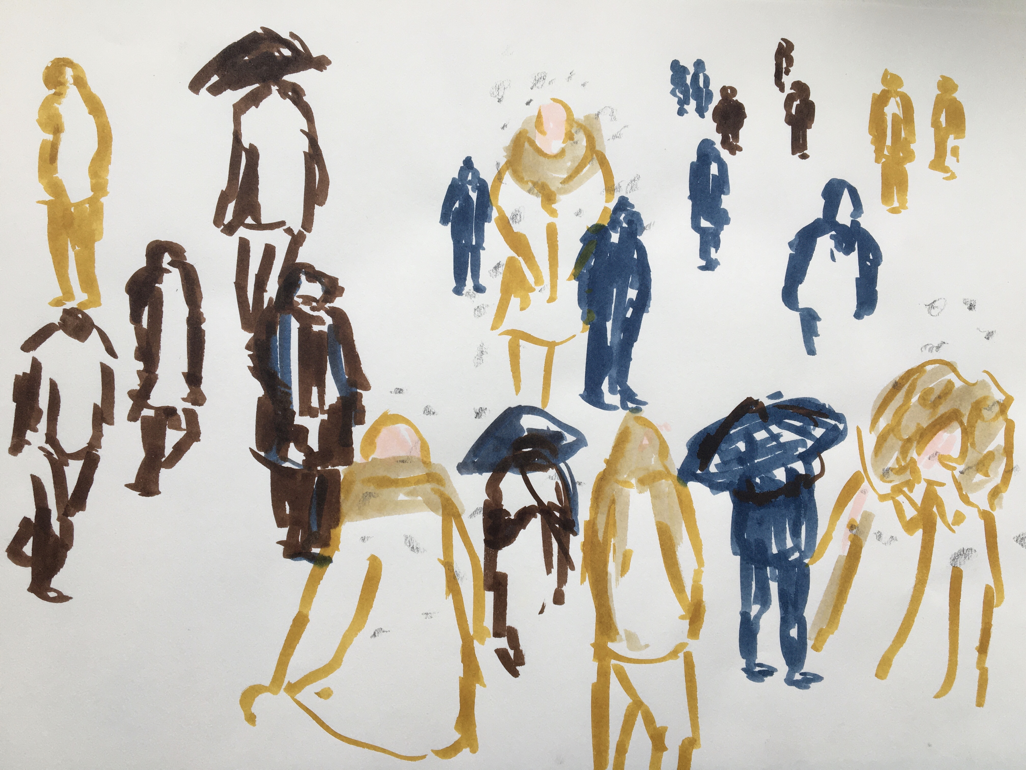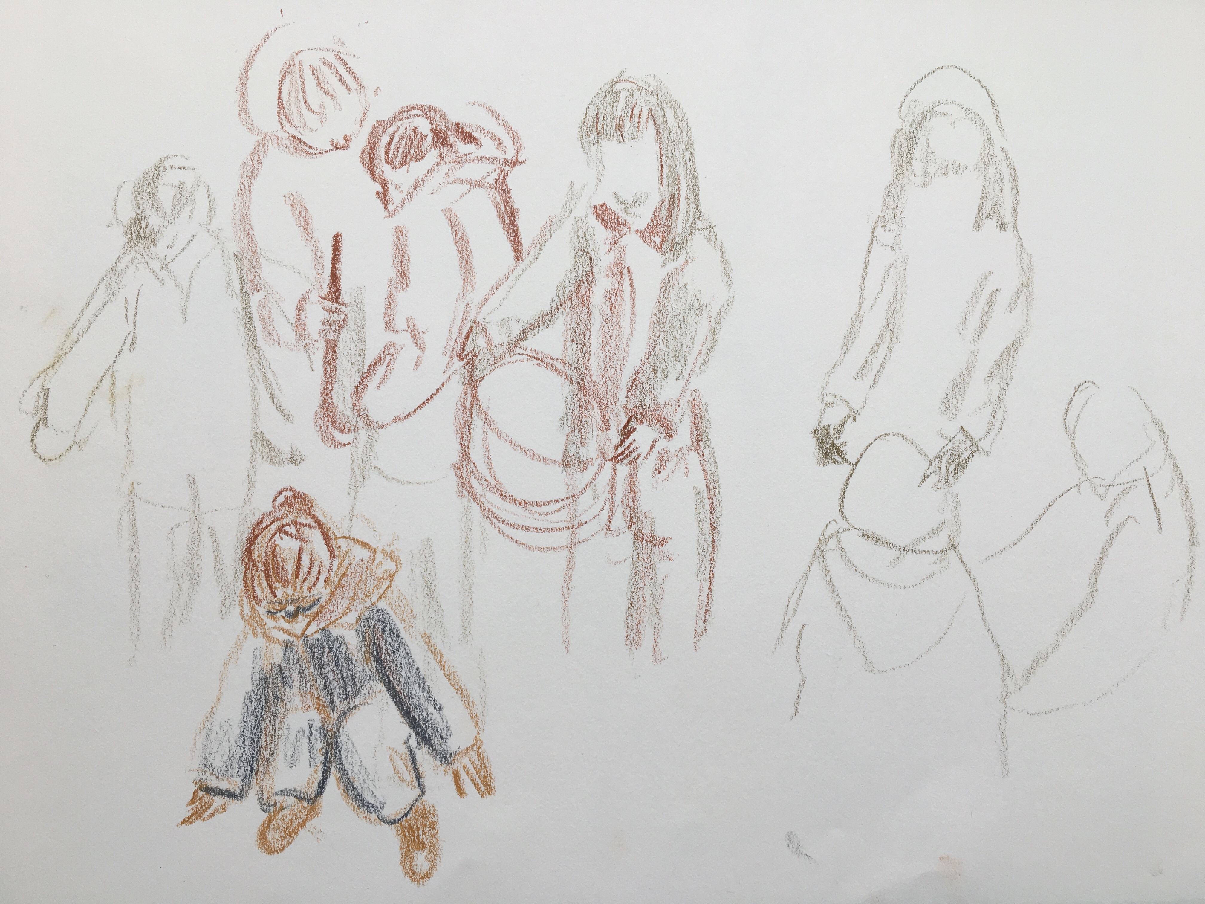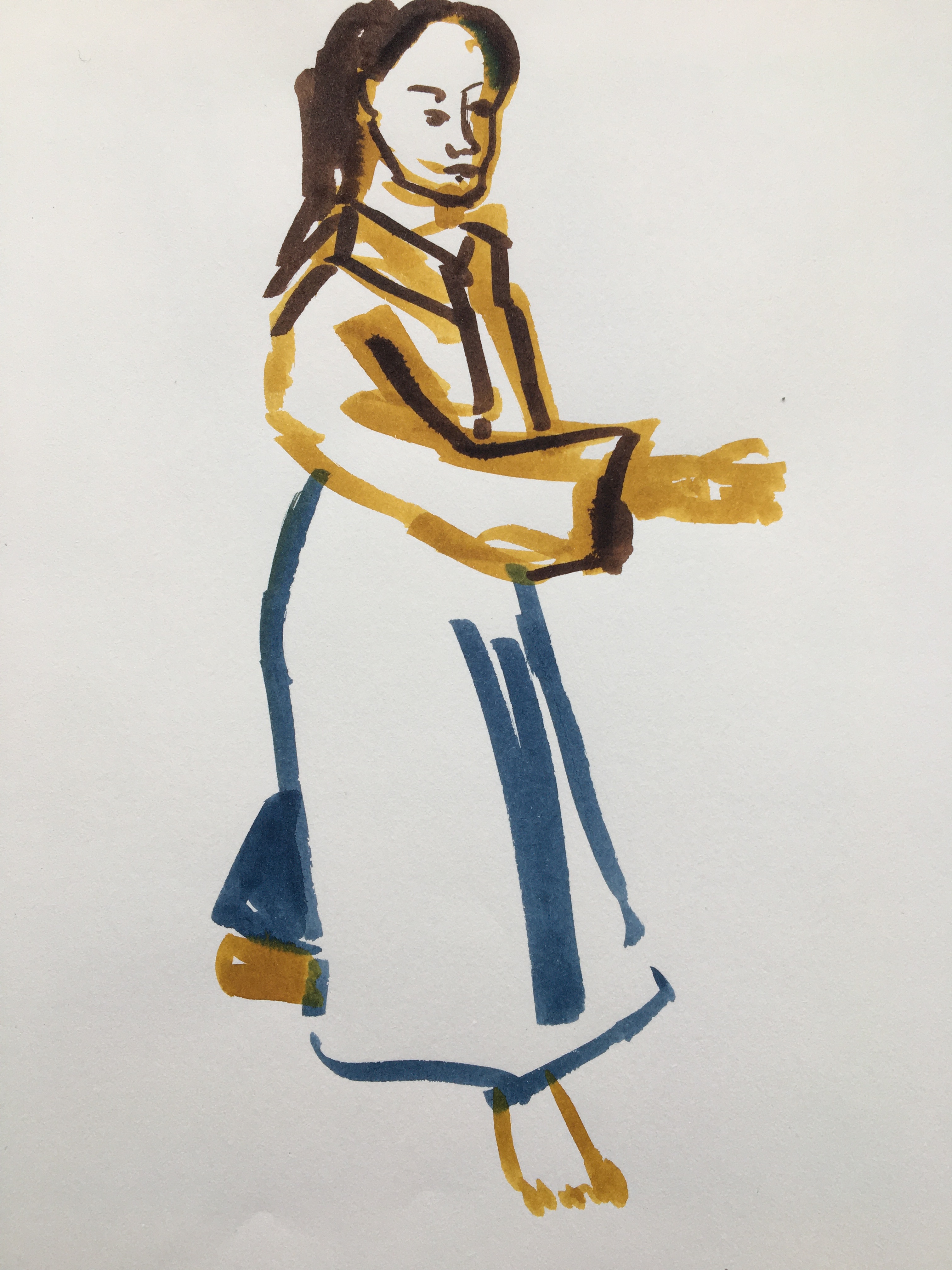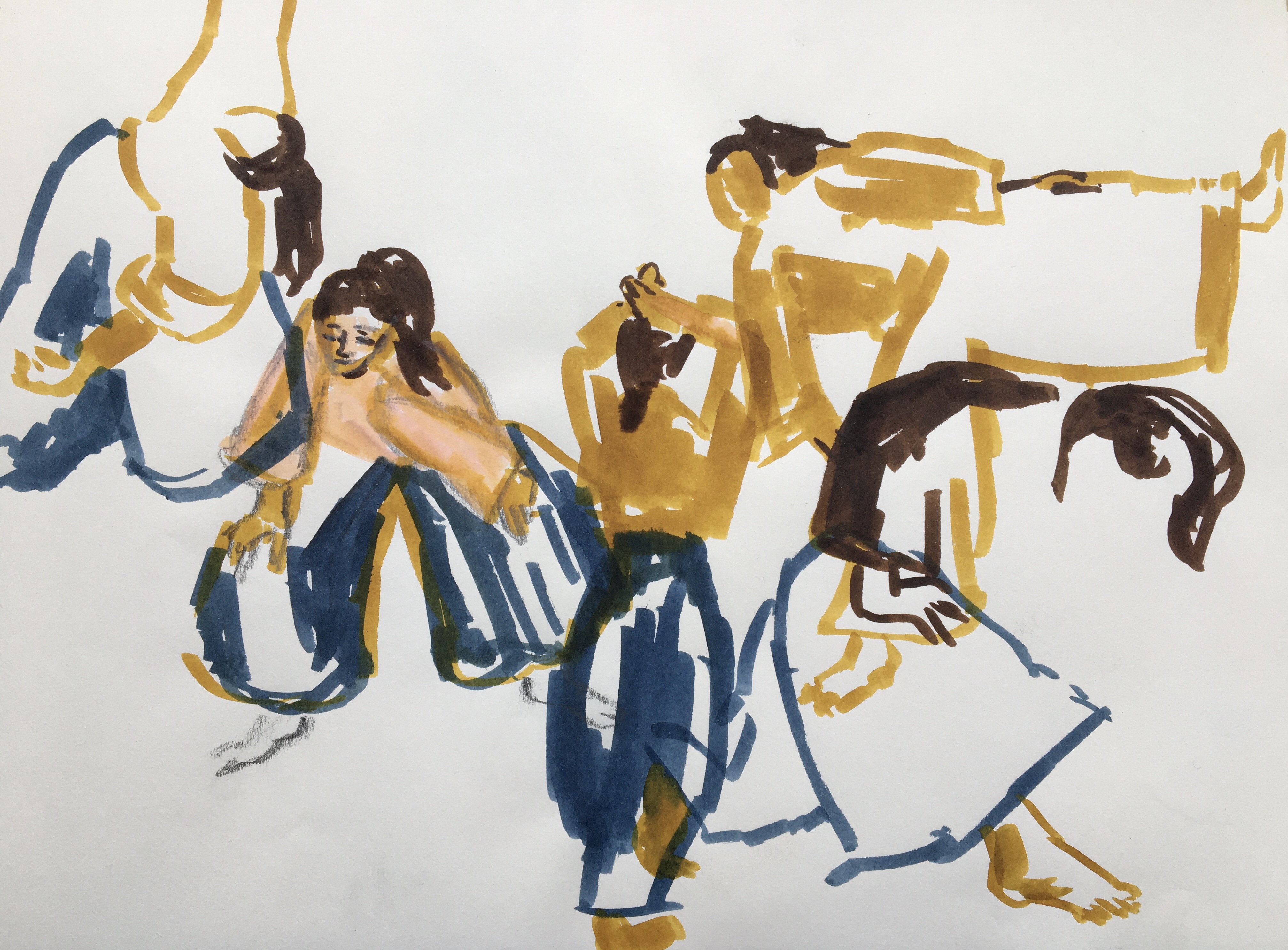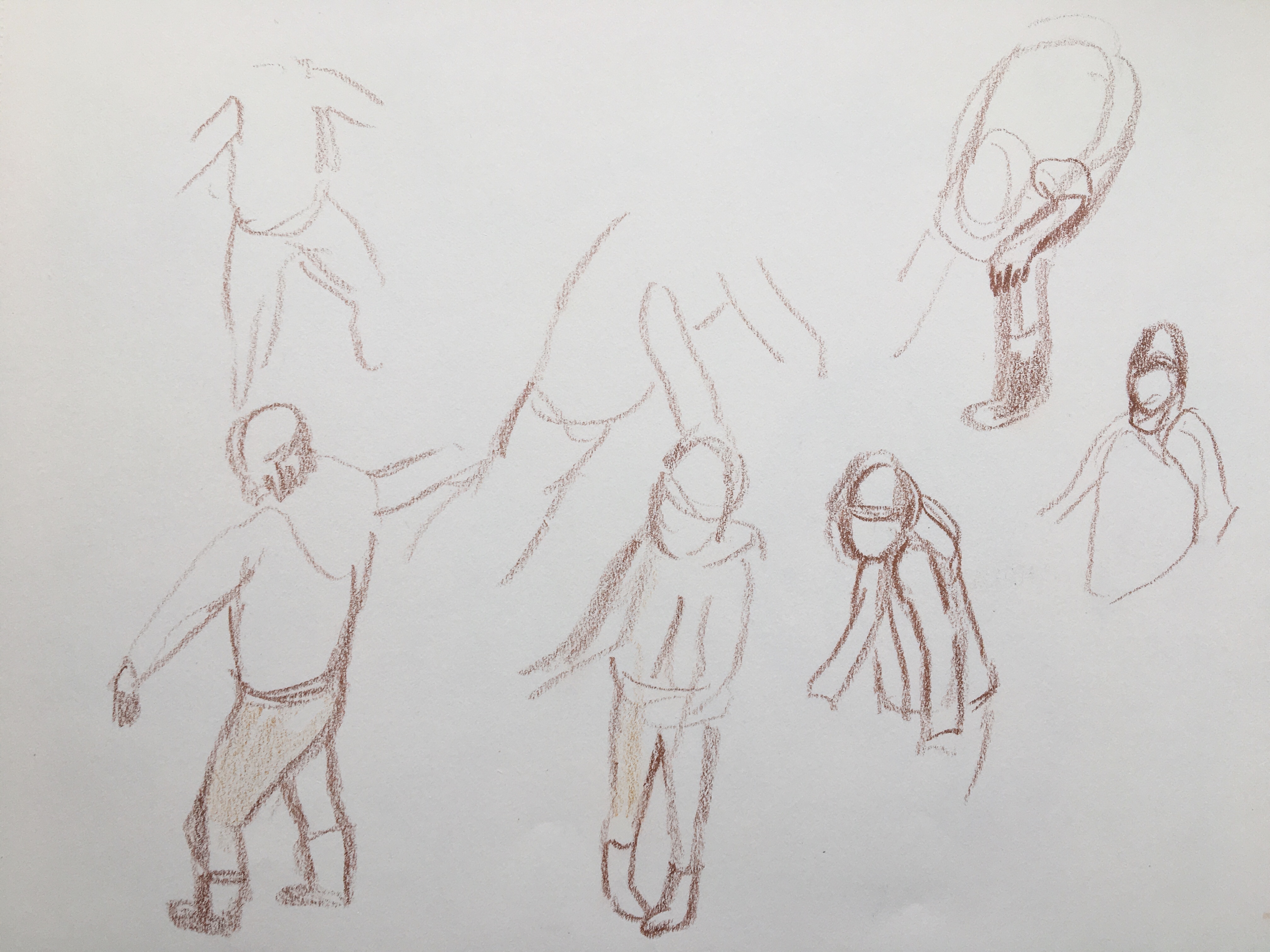 Here are some more drawings from my sketchbook. They are drawn from video using a mixture of brush pen and pencil to capture shape and movement. I was particularly focusing on proportion by drawing the shapes of the figures before adding any detail, to help me focus on looking at my subject 80% of the time and drawing 20% of the time.