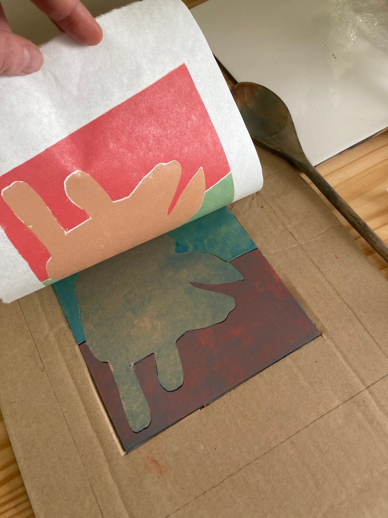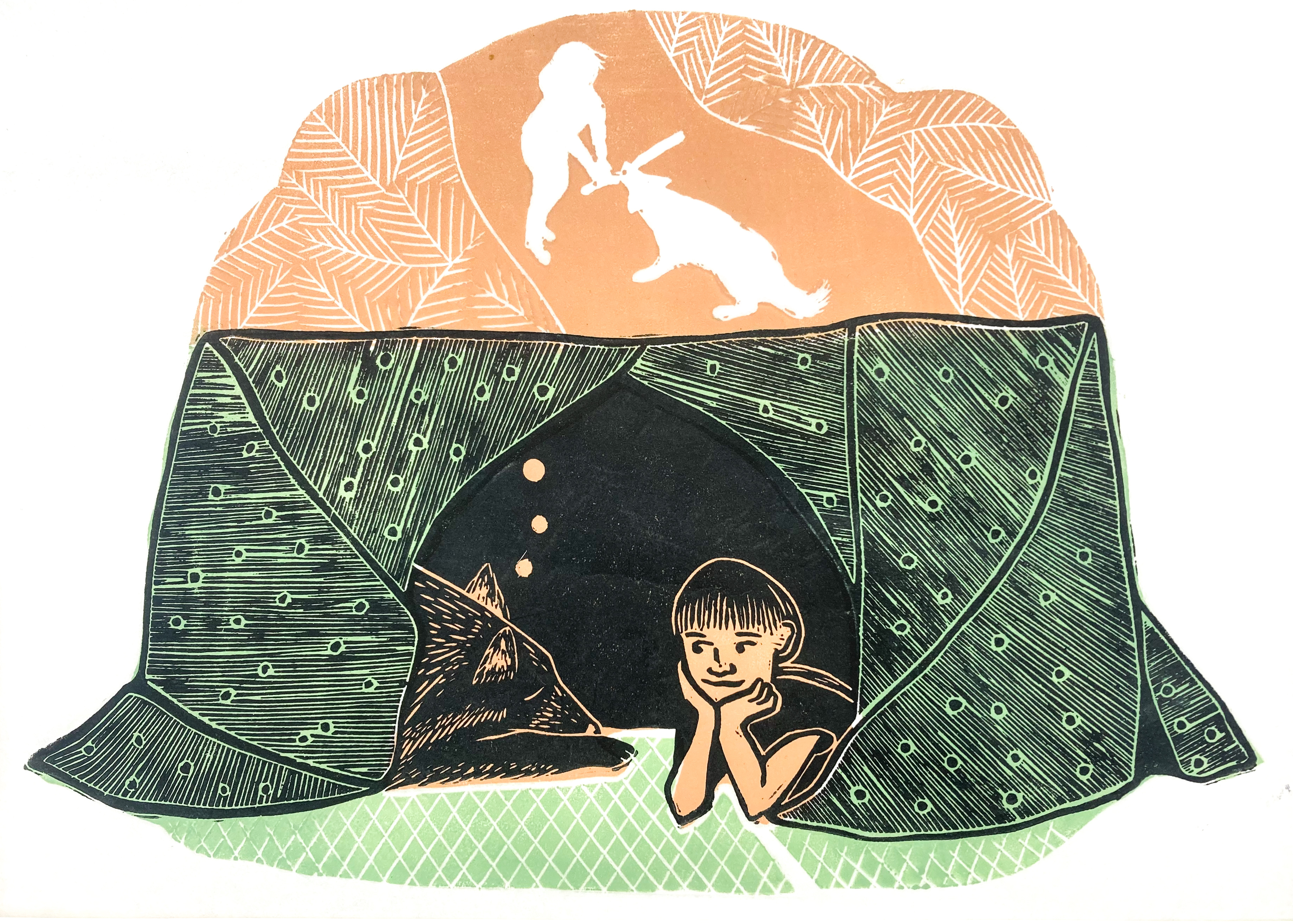 I use traditional Lino printing techniques that are hand burnished in my home studio. I particularly enjoy using a multi layer jigsaw technique. This example used 2 layers, the first being the ‘jigsaw’ layer where shapes are inked up and put together like a puzzle. Then the key block layer with the illustration is printed on top of the colour, which brings everything together. I love to work in a limited colour palette to heighten the mood and emotion of the illustrations.