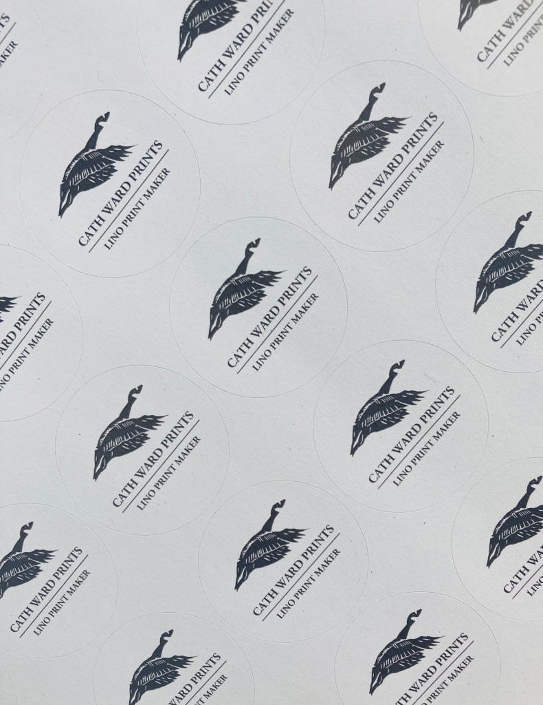With all my orders I put in a business card and use stickers to go on my prints and envelopes with my logo design on. I love using these because the logo is special to me. The goose is taken from my very first Lino print, the flying goose, that I’m packaging up here from my Folksy second sale last month. The goose came from a book idea I was developing while I studied on the CSACBI course